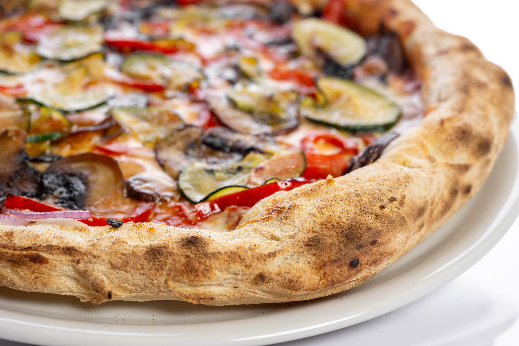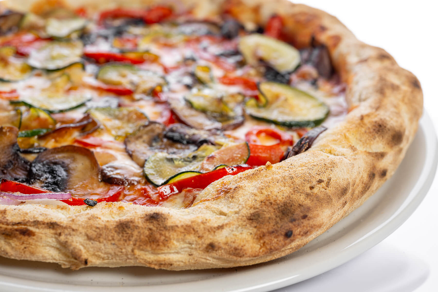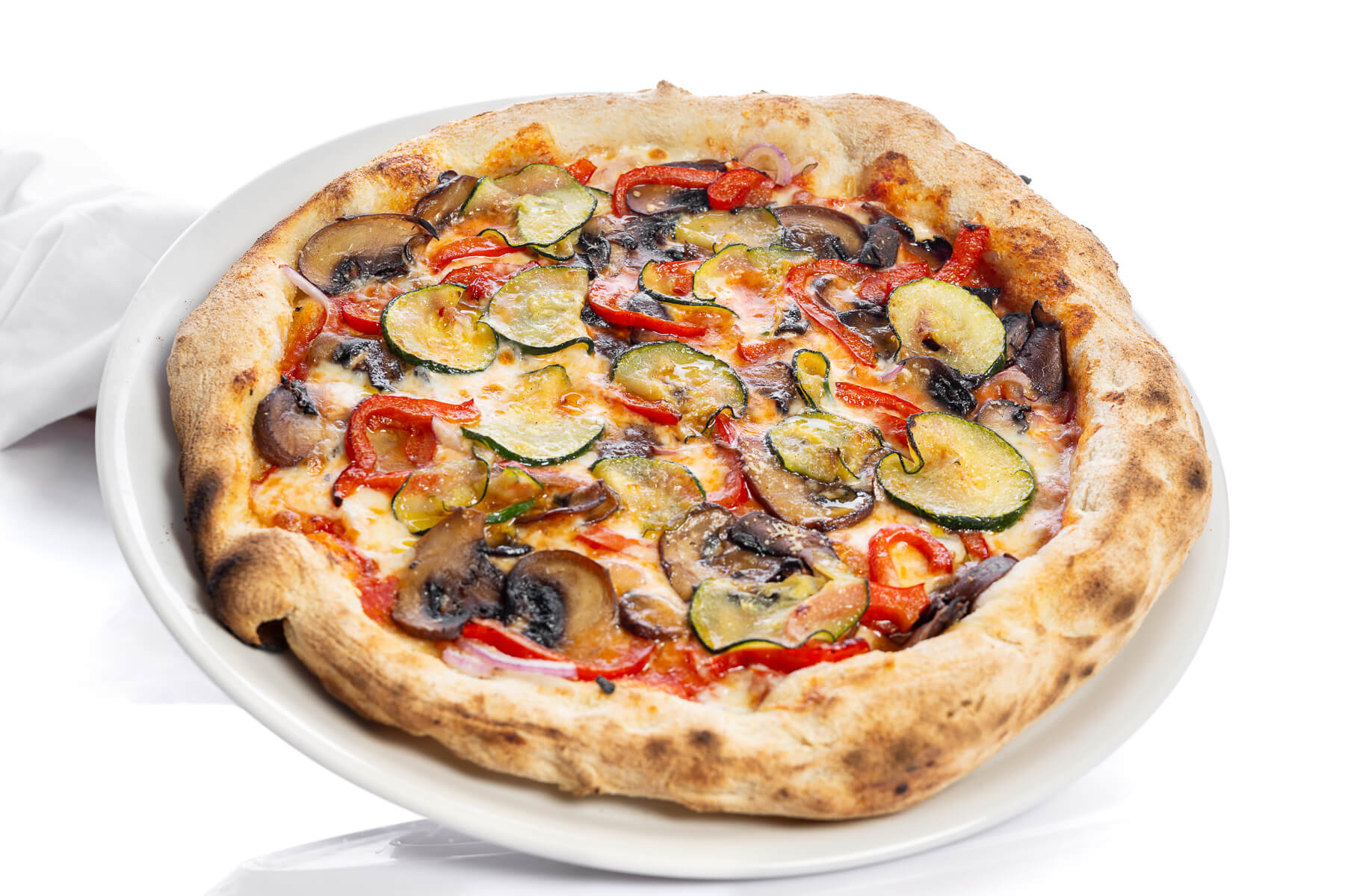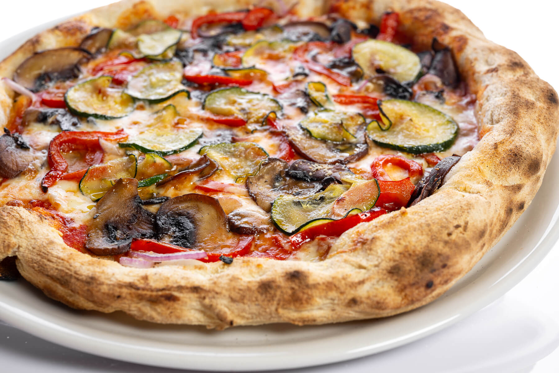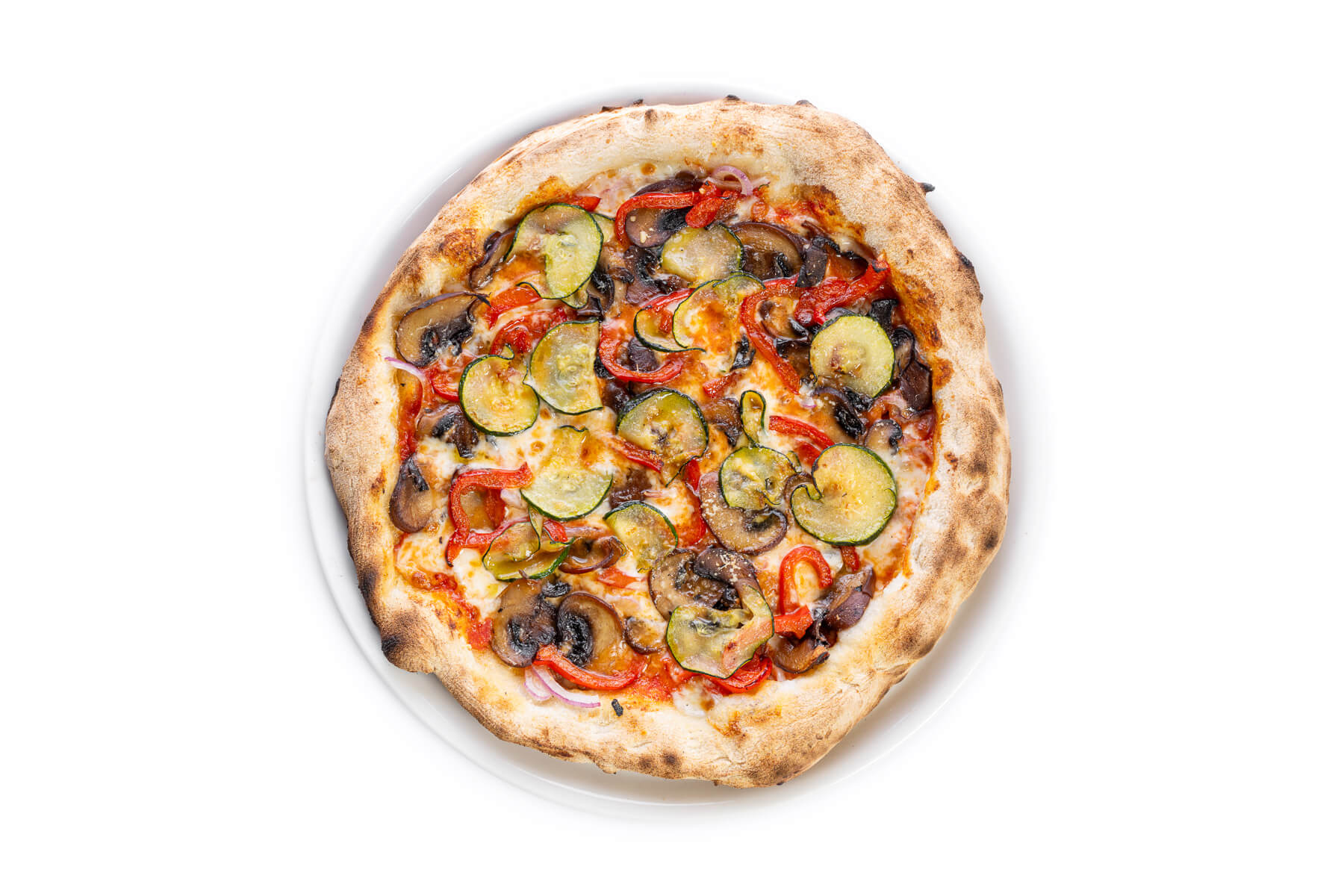 Base de tomate natural San Marzano, mozzarella Fior Di Latte y parmesano, cebolla roja, champiñón Portobello, pimiento rojo y calabacín salteados.