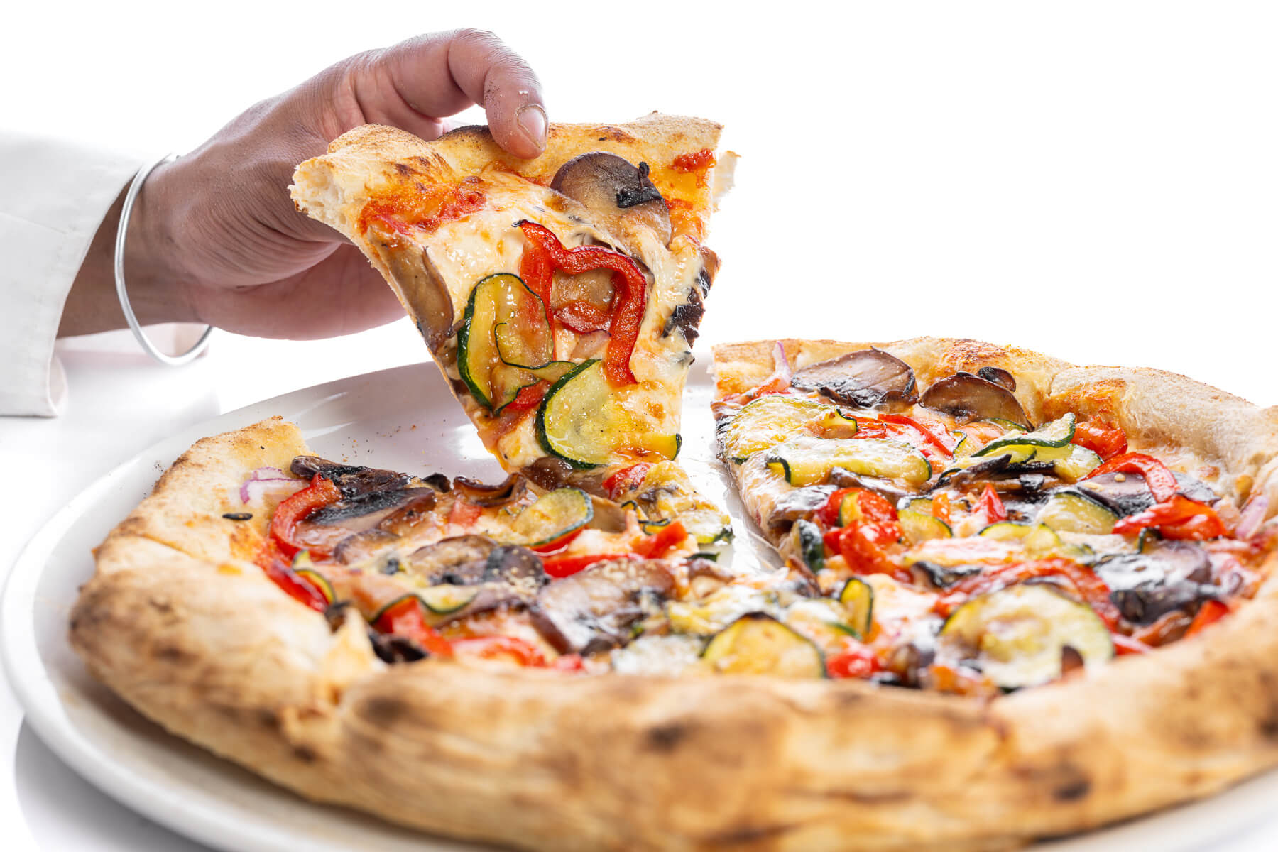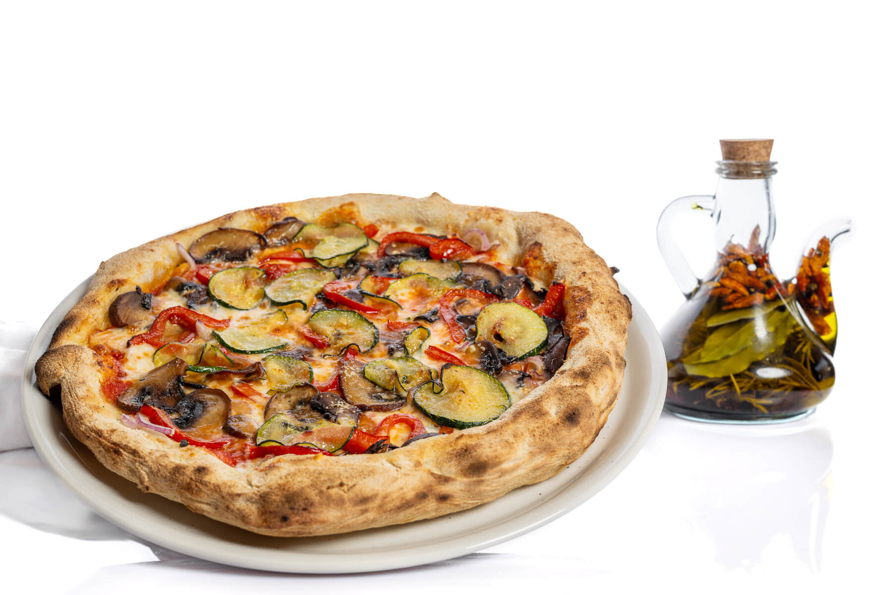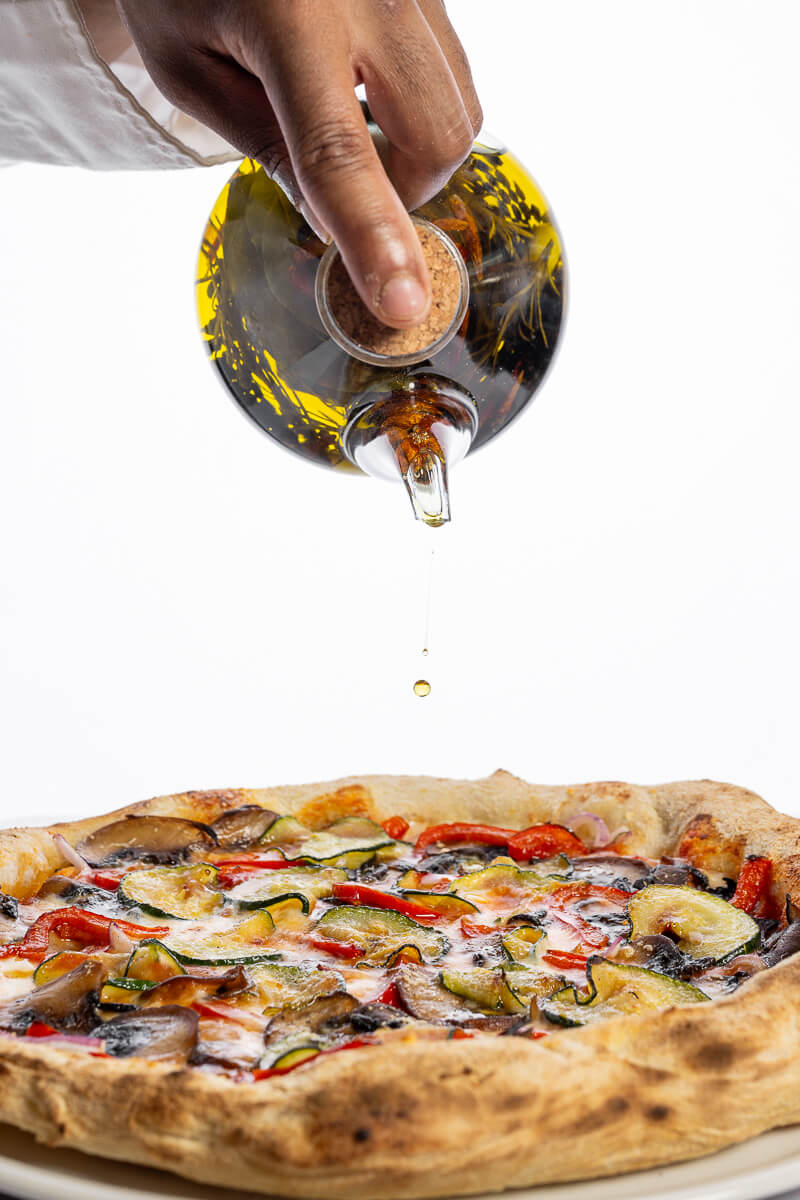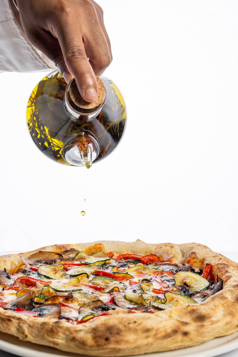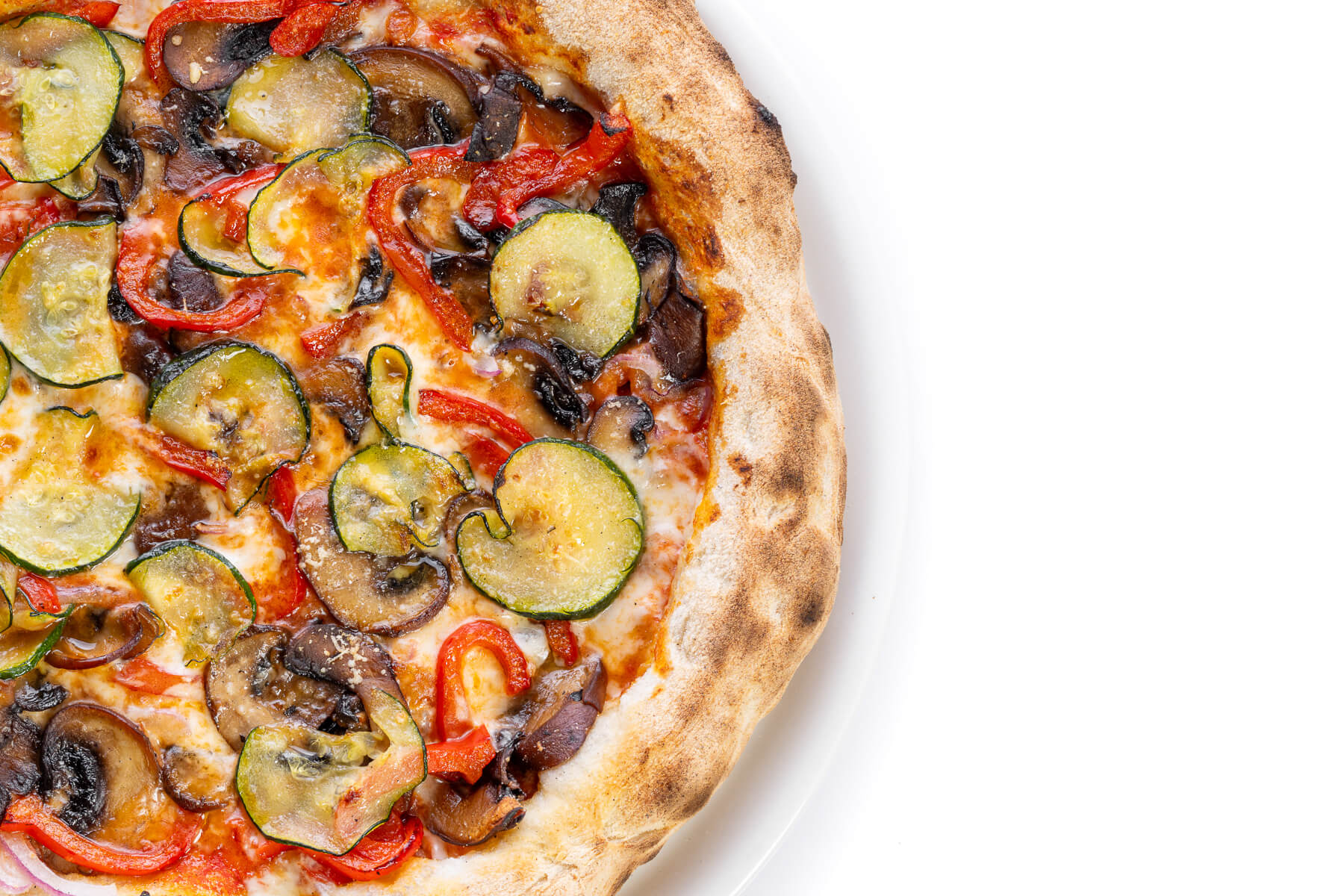 Base de tomate natural San Marzano, mozzarella Fior Di Latte y parmesano, cebolla roja, champiñón Portobello, pimiento rojo y calabacín salteados.