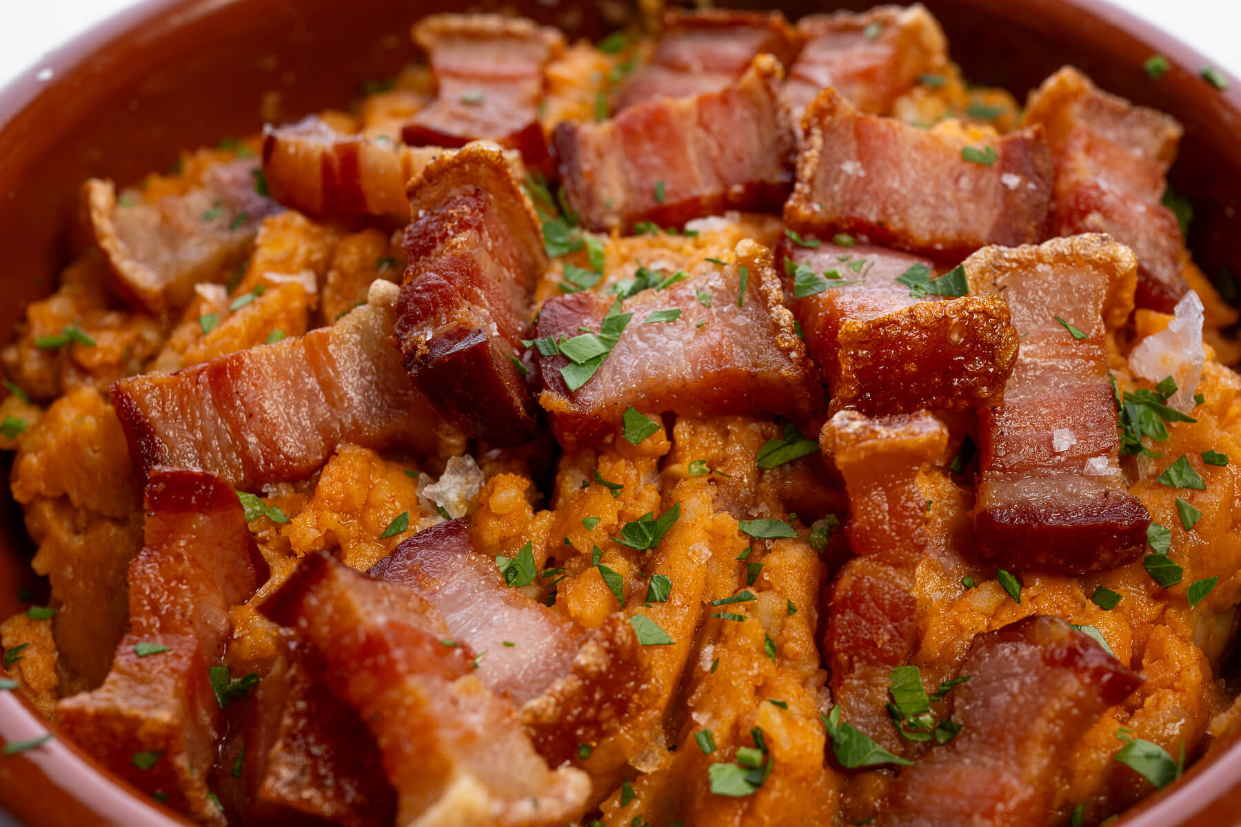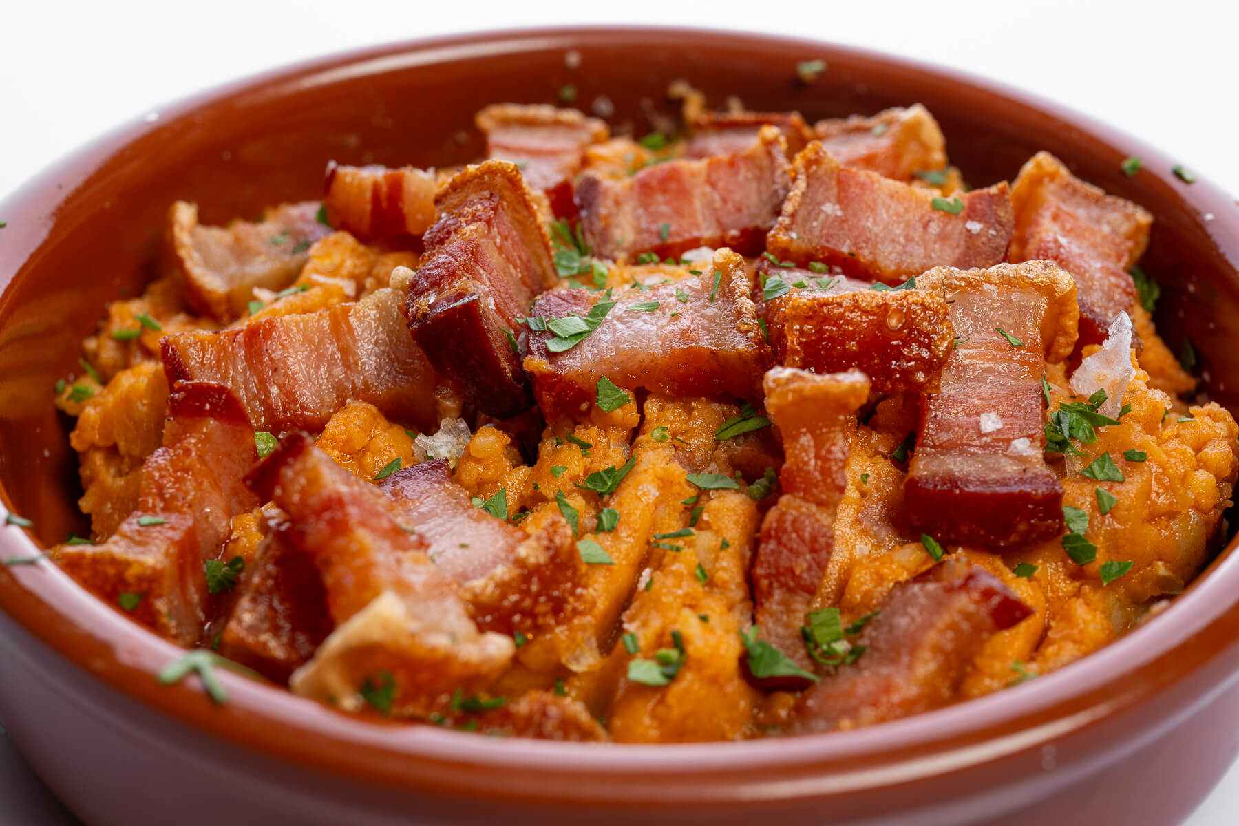 Crujientes torreznos de Soria con unas patatas revolconas a nuestro estilo con pimentón, aceite de oliva virgen y algún secreto de la cocina de mi familia.